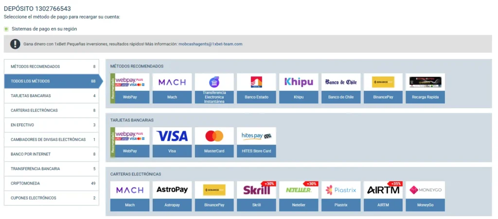 Durante mi año usando 1xBet, he probado todos los métodos disponibles para chilenos: